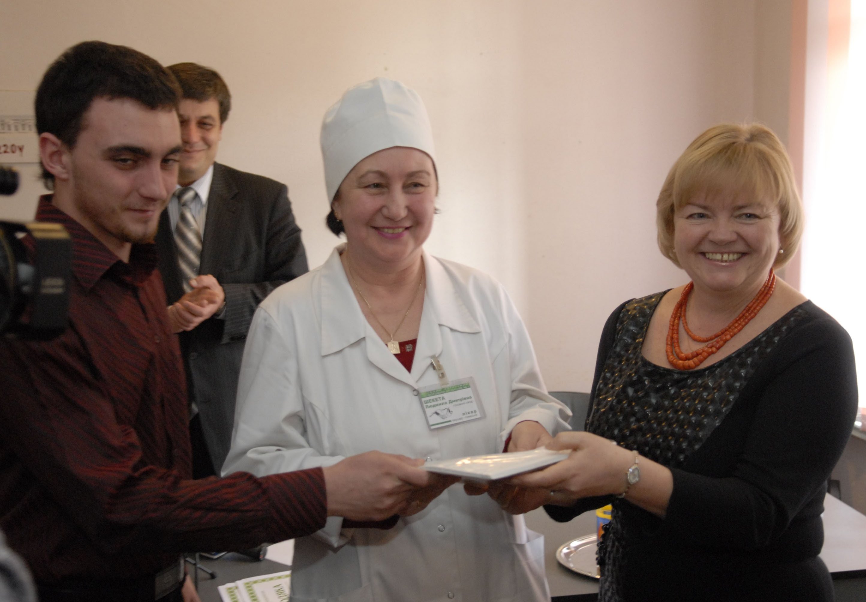 Студент ЛІБС Олександр Бондарчук та ректор УБС НБУ Тамара Смовженко передають головному лікарю пологового будинку №1 ...