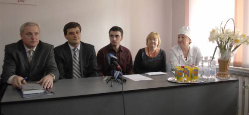 Прес-конференція з нагоди передачі інкубатора для пологового будинку №1. Разом з ректором, банкірами та чиновниками представник студентсва ЛІБС Олександр Бондарчук